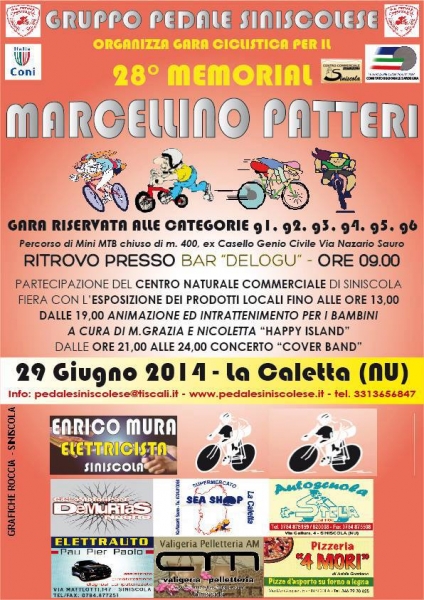 LA CALETTA - Il “Gruppo pedale siniscolese” organizza per oggi il 28° memorial Marcellino Patteri, gara ciclistica riservata alle categorie G1, G2, G3, G4, G5 E G6. L'appuntamento è alle 9.00 presso il Bar Delogu. L'iniziativa vedrà la partecipazione del Centro commerciale naturale di Siniscola con esposizione di prodotti locali fino alle 13.00. Il mercatino Artisti e Artigiani sarà presente dalle 9.00 alle 13.00 e dalle 18.00 in poi. A partire dalle 19.00 intrattenimento e animazione per bambini con Maria Grazia e Nicoletta (“Happy island”); a chiudere la serata (dalle 21.00 alle 24.00) sarà il concerto “Cover band".