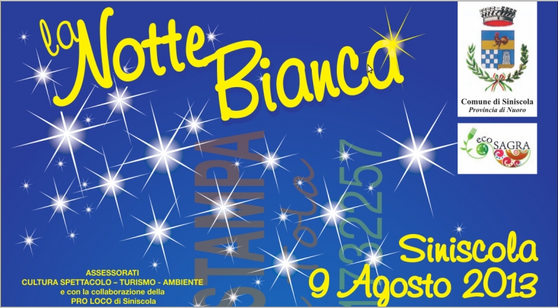 Dal pomeriggio all'alba, domani Siniscola diverrà una rete di intrattenimento fra arte, musica e stand gastronomici con varie tappe dislocate per le vie Roma, Sassari, Olbia, Matteotti e Pellico in occasione della Notte bianca. Organizzato dall'Amministrazione Comunale in collaborazione con la Pro loco, i comitati N.S. Delle Grazie, il priorato di N.S. di Fatima de La Caletta , operatori commerciali, giovani dell'hinterland e singoli cittadini, l' evento intende coinvolgere turisti e non attraverso un variegato programma. A inaugurare la ricca serata sarà la visita (prevista per le 17.00) alla grotta di Gana 'e Gortoe con gli esperti del Ceas; a partire dalle 20 apertura degli stand degli artigiani locali, del museo Luigi Oggiano, del mercatino dei riciclo presso la biblioteca, delle chiese del centro e animazione per bimbi. Presso gli stand gastronomici sarà possibile degustare prodotti locali: sa suppa, sevadas, maialetto e vitello arrosto, polpi, porchetta, bottarga, purpuzza, pecora in cappotto e torrone. Ad animare la serata una ricca serie di concerti e spettacoli dal vivo, tra i quali Red House, Creek noise (con la collaborazione di Ozzy Eventi) ed esibizione a cura del gruppo Maus. Non mancheranno i gruppi folk Thiu Juanne Piu e Cuccuru ’e janas, i tenores Luisu Ozzanu e il coro Baronia. Una diversificazione dell'offerta, dunque, che rende l' appuntamento (organizzato per il quinto anno consecutivo) motivo di interesse per tutte le preferenze e fasce d'età . Per informazioni sulla regolamentazione del traffico visitare il sito del Comune.
