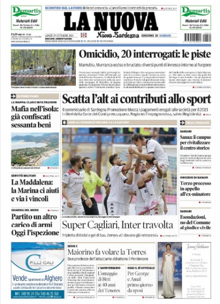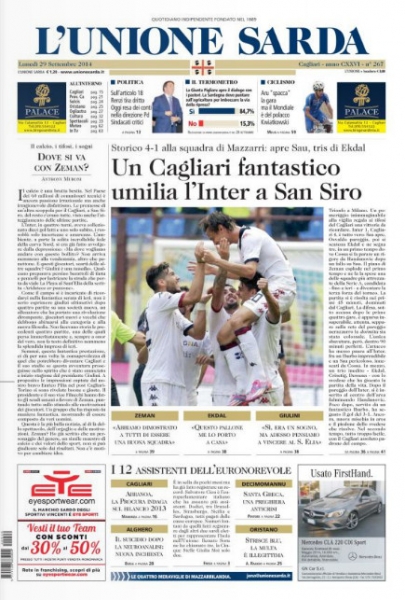 Lunis, die de crònaca isportiva cun sa bìnchida de su Cagliari contra a s'Inter. Sas bator retes de sos rujos-biaitos de Zeman comintzant a fàghere a bisare sos tifosos de s'iscuadra casteddaja de fùbalu, finas a como pagu brillante. Pro La Nuova «Super Cagliari, Inter istrombulada. Tripleta de Ekdal e rete de Sau. Zeman: “Nat-chi nche fìamus giai falados”». Gasi imbetzes L'Unione Sarda: «Unu Cagliari fantàsticu umìliat s'Inter in Santu Siru. Istòricu 4-1 a s'iscuadra de Mazzarri: aberit Sau, tris de Ekdal». Su diretore Muroni firmat s'editoriale «A in ue si andat cun Zeman?» cun unu meledu in pitzu de sos umores de sos amantiosos chi («francu sa fide mala a rùere de sa Curva Nord») aiant pèrdidu cale si siat ispera: «in su paisu de sos 60 milliones de allenadores (su fùbalu, Ndr) est galu passione irratzionale ma finas derrotismu redossu». La Nuova aberit però cun un'àtera crònaca “isportiva”: «Iscatat s'alt a sos contributos a s'isport. Su cummissàriu de Sardegna Promozione arreat sos pagamentos erogados a sas sotziedades pro su 2013. Sos annotos de sa Corte de sos contos ponent oriolu. Regione: s'impignu abarrat, francu illegitimidade».