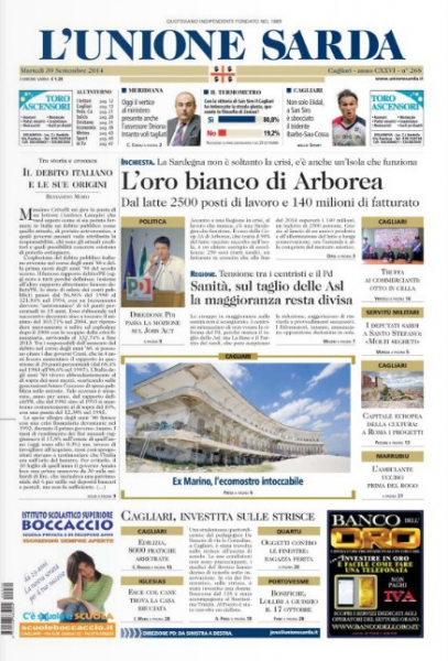 Meridiana: eris s'amministradore delegadu Roberto Scaramenlla at addobiadu su presidente de sa Giunta sarda Pigliaru e s'assessore de sos trasportos Deiana antitzipende·lis su pranu industriale de sa cumpangia aèrea chi oe at a èssere presentadu a su ministru de su traballu Poletti. La Nuova: «Sos pranos Meridiana: conca a Nàpoli. Sa cumpangia punnat a creare sa base sua in Campània pro sos bolos internatzionales». Ma in intro de sas pàginas de su giornale amus finas sas decraratziones de su presidente Marco Rigotti chi ponent in oriolu sos traballadores: «Sena litzentziamentos s'azienda est cundennada a mòrrere». La Nuova sighit cun sa foto-notìtzia relativa a sos istudiantes chi galu non si sunt laureados (in prus de sos 20 mìgia): «Ateneos, sos datos de Il Sole 24 ore: Tàtari e Casteddu ghiant sa classìfica». Màllia niedda finas in s'edilìtzia: «Est Nùgoro – leghimus – sa provìntzia sarda in ue sa crisi de s'edilìtzia est prus forte. No andat mègius in Tàtari». In prima pàgina b'at finas logu pro sa compidada de sos deputados sardos in s'arsenale de La Maddalena: «Enormes sas cantidade de esplosivos». A comintzu de pàgina sos resurtados de s'autopsia fata a s'ambulante mortu in Marrùbiu: «mortu e posca brusiadu». Nova chi agatamus finas in L'Unione Sarda chi, però, ponet àteru in evidèntzia. A comintzare dae s' inchesta in pitzu de «S'oro biancu de Arborea»: «Dae su late 2500 postos de traballu e 140 milliones de faturadu». In prus b'amus sas cuntierras intre tzentristas e Pd: «Sanidade, subra sa mèngua de sas Asl sa majoria abarrat partzida». Pro su chi pertocat sas novas “italianas” ambos sos giornales rimandant a sos èsitos de sa diretzione natzionale de su Pd chi at detzisu in pitzu de su “jobs act”.