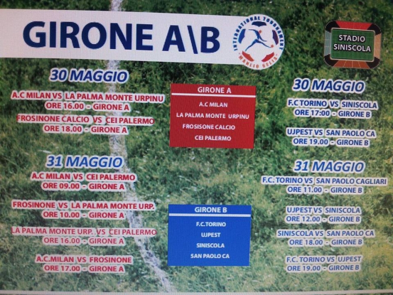 Allo stadio " Ghirtala " si svolgeranno il 30 maggio alle ore 16.00 AC Milan vs La Palma Monte Urpinu, alle ore 17.00 FC Torino vs Siniscola, alle 18.00 Frosinone Calcio vs Cei Palermo, a chiudere la giornata Ujpest vs San Paolo Cagliari; il 31 maggio alle ore 9.00  AC Milan vs Cei Palermo, alle ore 10.00 Frosinone vs La Palma Monte Urpinu, alle ore 11.00 FC Torino vs San Paolo Cagliari, alle ore 12.00 Ujpest vs Siniscola.