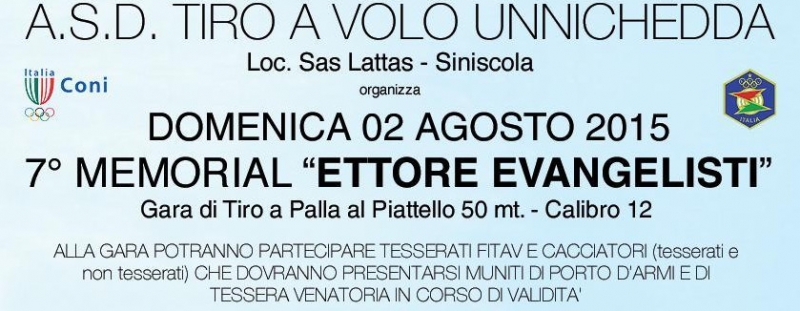 Domenica 2 agosto (iscrizioni dalle 9.00 alle 18.30) presso il  Campo di Tiro a Volo sito in località Unnichedda, si disputerà una gara di tiro a palla al piattello da 50mt – calibro 12 in memoria di Ettore Evangelisti che «con il suo lavoro e la sua passione per il tiro a volo, ha reso possibile la realizzazione dell'impianto sportivo».