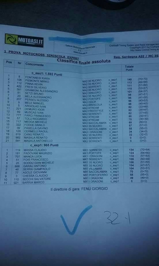 Le piogge delle ore precedenti hanno fatto del crossodromo di Berchida una pista ottimale per i 138 piloti accorsi alla prima gara del campionato sardo Moto Asi. La tappa siniscolese - organizzata dal Motoclub Siniscola - si è aperta con il ricordo di Cristian Cocco, socio dell'associazione per 25 anni, prematuramente scomparso nel novembre 2015.