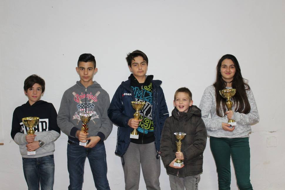Nella classe Under 14 «i nostri campioni hanno letteralmente dominato sulle scacchiere, monopolizzando il podio. Sono tutti ragazzi dodicenni che hanno cominciato a giocare 3 anni fa sui banchi di scuola ma che continuano ad allenarsi al Centro Giovanile di Siniscola e nell’Oratorio di La Caletta. Al 3° posto con 5 punti su 7 si è piazzata Gemma Soro (La Caletta), al 2° con 6 punti Francesco Biancu di Siniscola e primo assoluto, a punteggio pieno, Mauro Contu di La Caletta, già vincitore dell’Open Capodanno Siniscola 2016 e degli Open di Loculi e di La Caletta nel 2015. Tutti e cinque hanno staccato il biglietto per la finale. Per gli altri che non sono riusciti nell’impresa si sta già lavorando per una seconda chance: un torneo di qualificazione da svolgersi a Siniscola entro fine Maggio. Gli altri componenti della spedizione: Luca e Federica Carta, Daniele De Murtas (Nuoro), Veronica Petta, Gabriele Assaiante (La Caletta), Enrico e Marco Multazzu, Alessio e Greta Castangia, Christian Mele, Sara Rosu, Alessandro Secchi, Francesco ed Ilenia Podda e la mascotte, il più piccolo della comitiva, Alessio Bomboi, 6 anni vera e propria speranza dello scacchismo siniscolese».