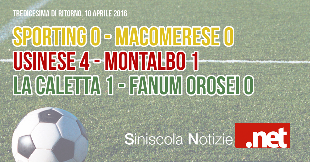Condividi su: Sporting 0 - Macomerese 0 Usinese 4 - Montalbo 1 La Caletta 1 - Fanum Orosei 0 Condividi su: Argomenti: Siniscola Sporting Polisportiva Montalbo Polisportiva La Caletta