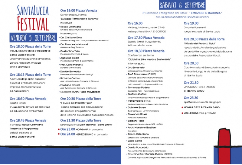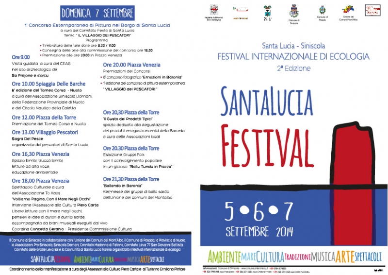 SANTA LUCIA - Inizia oggi la seconda edizione del “Santa Lucia Festival” con tre giornate dedicate ad «ambiente, cultura, tradizioni, musica, arte e spettacoli». Nel programma, uno spazio dedicato ai bambini in piazza Venezia con letture ad alta voce all'insegna dell'educazione ambientale; le degustazioni dei prodotti tipici in piazza della Torre; la sagra del pesce presso il Villaggio dei pescatori; le visite guidate a cura del Ceas nella grotta di Gana 'e Gortoe e nel sito archeologico de Sa Prejone 'e s' Orcu; due conferenze (una su “Sviluppo territoriale e turismo” e l'altra su “Ciclabilità 2.0 e nautica sostenibile”); le esibizioni dei gruppi folk, canti a tenore itineranti e giocolieri. La tre giorni ospiterà anche due concorsi (uno estemporaneo di pittura dal tema “Il villaggio dei pescatori” e uno fotografico dal titolo “Emozioni in Baronia) e un torneo di corsa / nuoto. Non mancheranno gli spettacoli con i concerti di Morgana Brais, Hertz sound, Momar Gaye & Zaman band e Valleskas, il cabaret di Benito Urgu e il teatro dei To Kaos con “Voltiamo pagina...con il mare negli occhi”. L'inaugurazione avrà luogo questa sera alle 18.00.