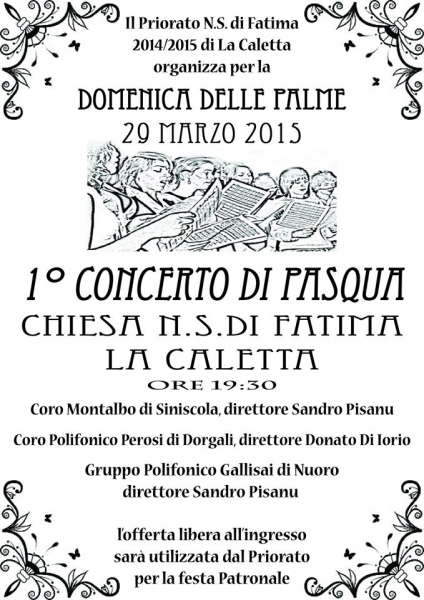 Il Priorato N.S. di Fatima organizza per domenica 29 marzo (domenica delle palme) alle 19.30, presso la chiesa N.S. di Fatima, il “1° concerto di Pasqua”. Si esibiranno il Coro Montalbo di Siniscola, il Coro Polifonico Perosi di Dorgali e il Gruppo Polifonico Gallisai di Nuoro. L'ingresso sarà a offerta libera ed il ricavato sarà utilizzato dal Priorato per la festa Patronale.
