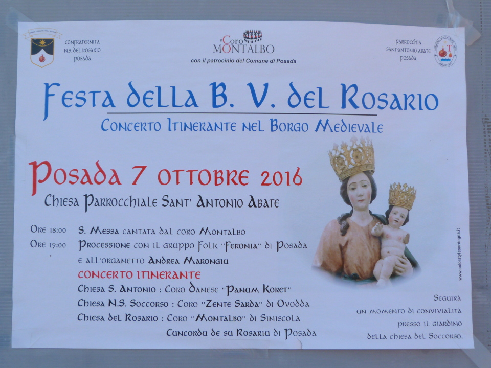 POSADA – Si terranno venerdì 7 ottobre i festeggiamenti in onore della Beata Vergine del Rosario. Organizzati dall'omonima Confraternita, dalla Parrocchia di Sant'Antonio abate e dal Coro “Montalbo” di Siniscola (con il patrocinio dell'amministrazione comunale posadina), si articoleranno nella santa messa in Parrocchia (alle 18.00, cantata dal coro polifonico diretto dal maestro Giampaolo Selloni) e in una processione (alle 19.00, con il locale gruppo folk “Feronia” accompagnato da Andrea Marongiu all'organetto). A seguire il concerto itinerante con le esibizioni del coro danese “Panum Koret” (chiesa Sant'Antonio), dei “Zente sarda” di Ovodda (chiesa N.S. Soccorso), del coro “Montalbo” e del locale “Cuncordu de su Rosariu” (presso l'omonima chiesa).